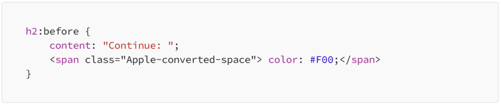 This CSS is a selector which lets you pick a CSS object and insert content in front of each occurrence of that particular class. In the below example, there is a continue section added before any H2 tag.